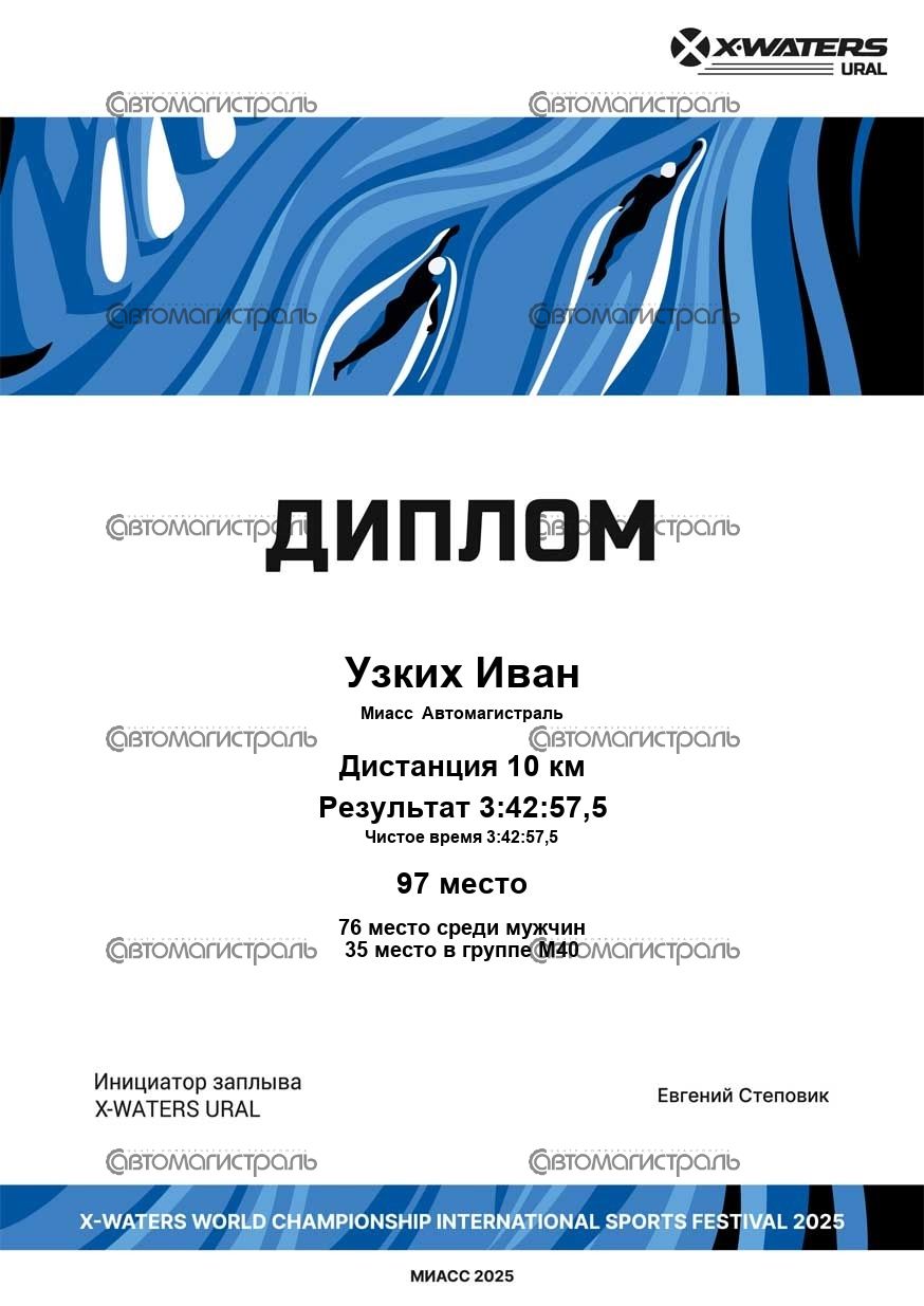 Он принял участие в легендарном мероприятии X-Waters Ural на озере Тургояк — одном из самых сложных и престижных заплывов в регионе. Наш герой проплыл две дистанции: индивидуальный заплыв на 10 км и эстафету 3×1 км. Это настоящее испытание для сильнейших, требующее не только физической подготовки, но и невероятной силы воли.
